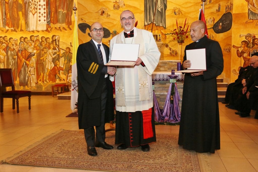حلفان اليمين واستلام شهادة المزاولة تم أمام الكاردينال بييرباتيستا بيتسابالا، بطريرك القدس للاتين ضمن الاحتقال الذي أقيم ضمن رتبة صلاة روحية ترأسها البطريرك، ورئيس محكمة البداية، المستلم حديثًا، الأب الدكتور أكثم حجازين، ورئيس محكمة الاستئناف الأب مجدي السرياني وموظفي، محكمة البداية والاستئناف، و المحامون والمحاميات.