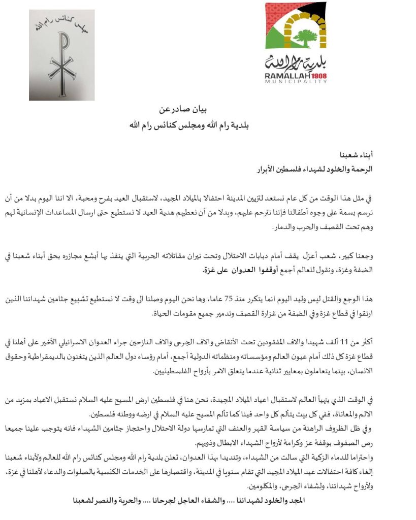 وفي نفس السياق الغت كنائس مدينة رام الله كافة مظاهر الاحتفالات في ظل استمرار الحرب على غزةواقتصرت أعياد الميلاد المجيدة على الشعائر الدينية،