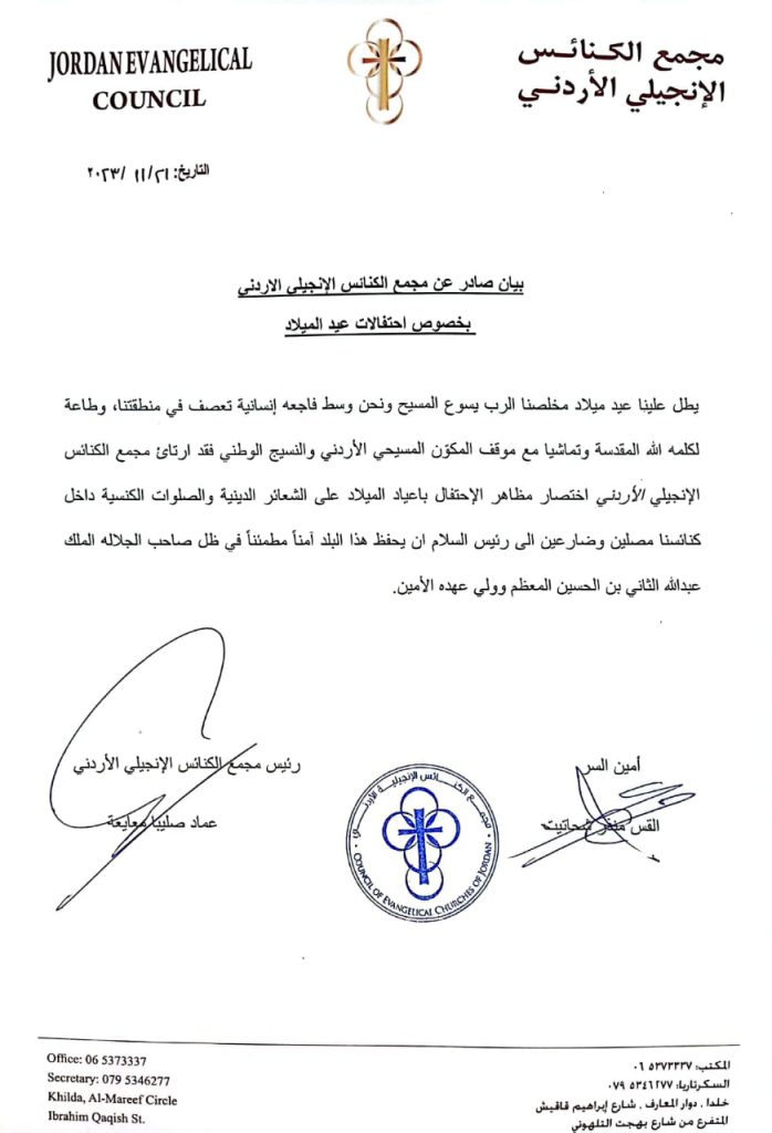 الاعلان صدر بعد اجتماع الهيئة الادارية برئاسة اللواء المتقاعد عماد صليبا المعايعة ان قرار جاء بسب الظروف التي تعصف المنطقة. “يطل علينا عيد ميلاد مخلصنا الرب يسوع المسيح ونحن وسط فاجعه إنسانية تعصف في منطقتنا، وطاعة لكلمه الله المقدسة وتماشيا مع موقف المكوّن المسيحي الأردني والنسيج الوطني فقد ارتائ مجمع الكنائس الإنجيلي الأردني اختصار مظاهر الإحتفال باعياد الميلاد على الشعائر الدينية والصلوات الكنسية داخل كنائسنا مصلين وضارعين الى رئيس السلام ان يحفظ هذا البلد آمناً مطمئناً في ظل صاحب الجلاله الملك عبدالله الثاني بن الحسين المعظم وولي عهده الأمين”.
