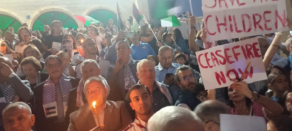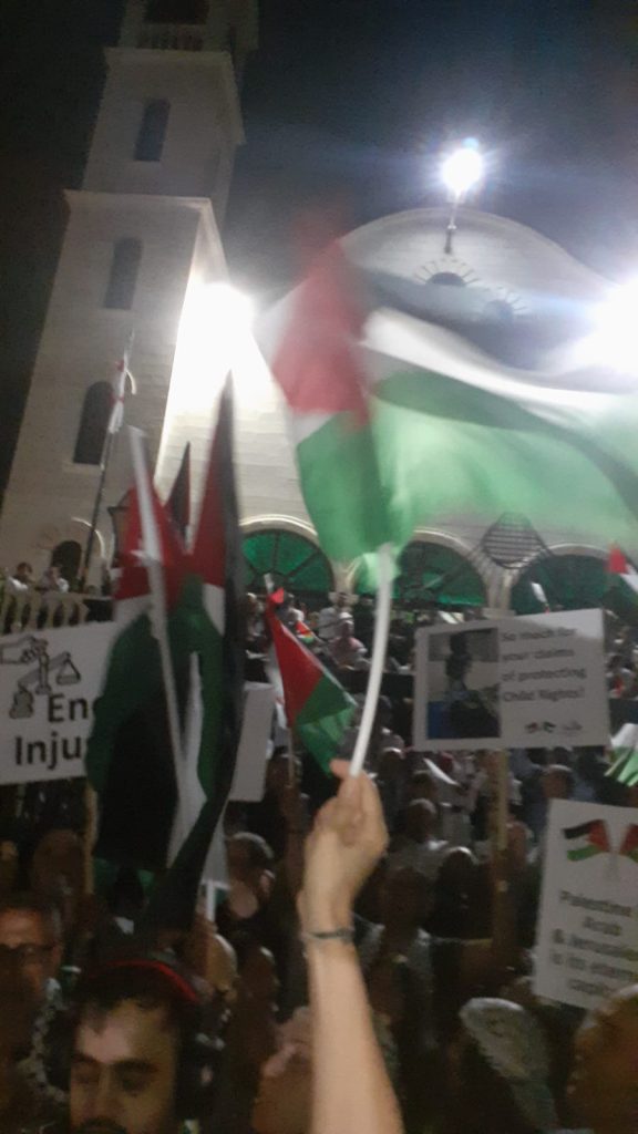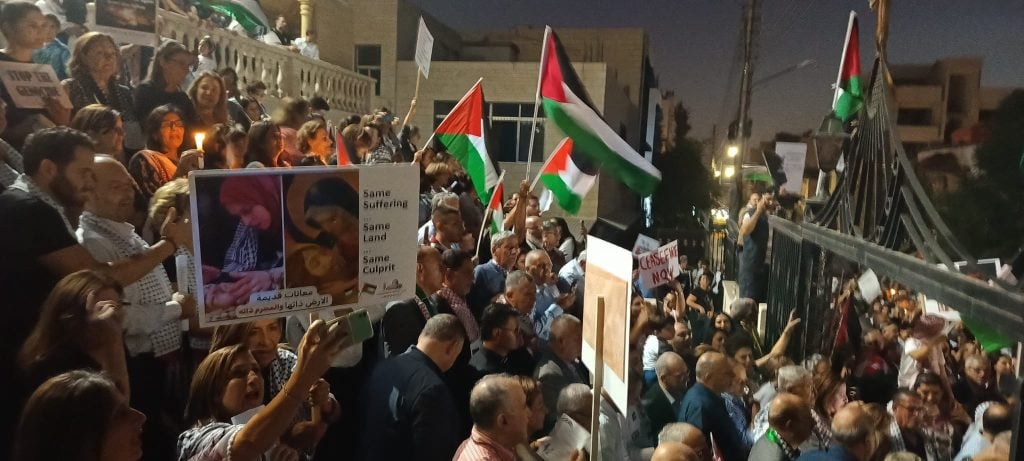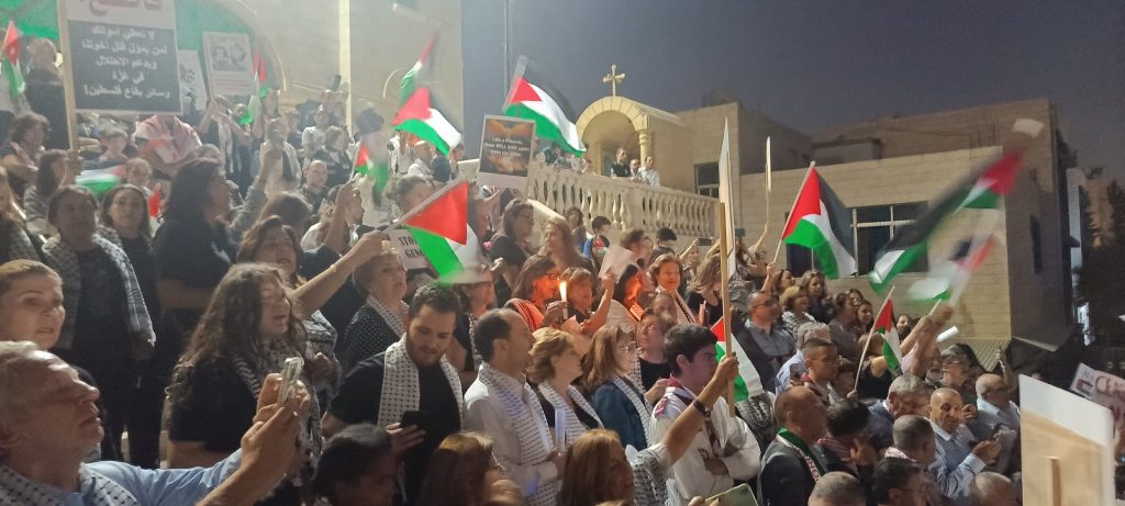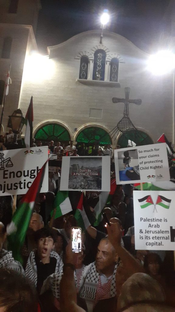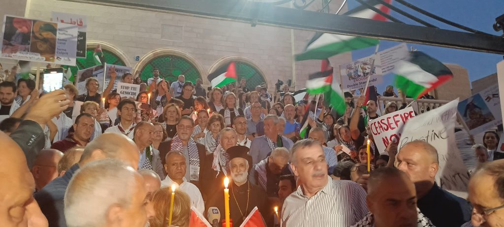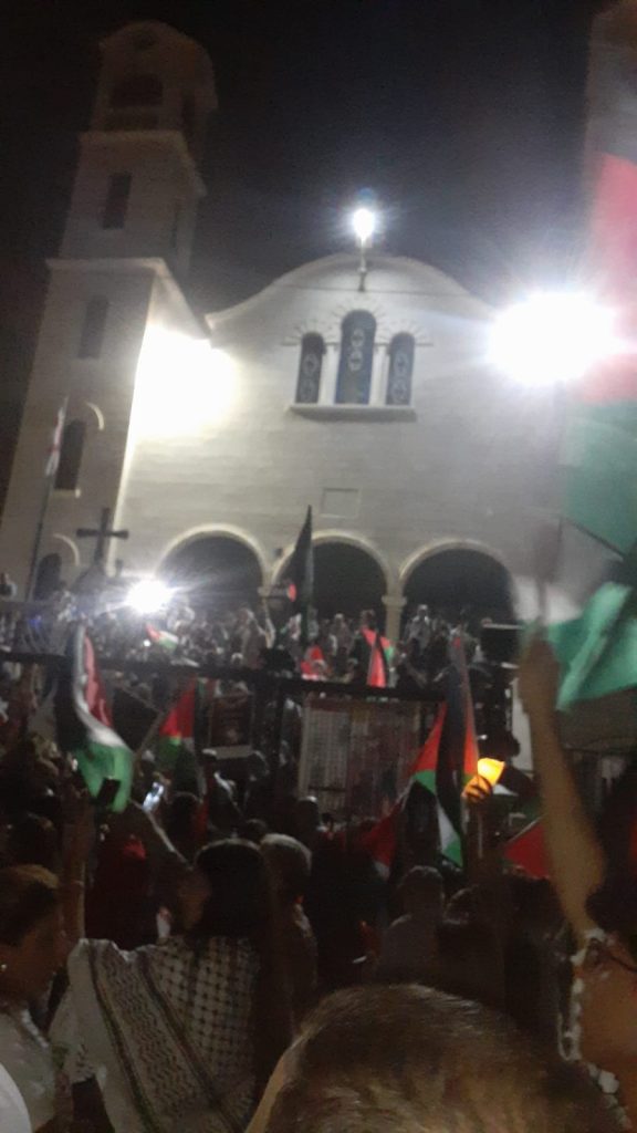 اعتصم المئات من أبناء الطائفة الأرثوذكسية من أعضاء هيئات ومؤسسات أمام الكنيسة الأرثوذكسية في الصويفية لتعبير عن رفضهم لسياسة الاحتلال الاسرائيلي ضد أبناء قطاع غزة وعمليات الإبادة الجماعية لهم واستهدافهم الاطفال والنساء بشكل كبير.