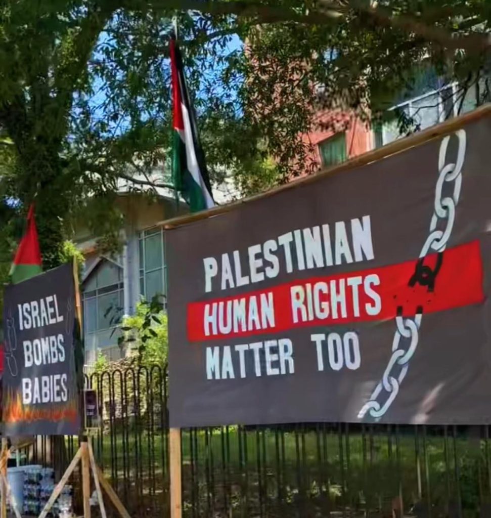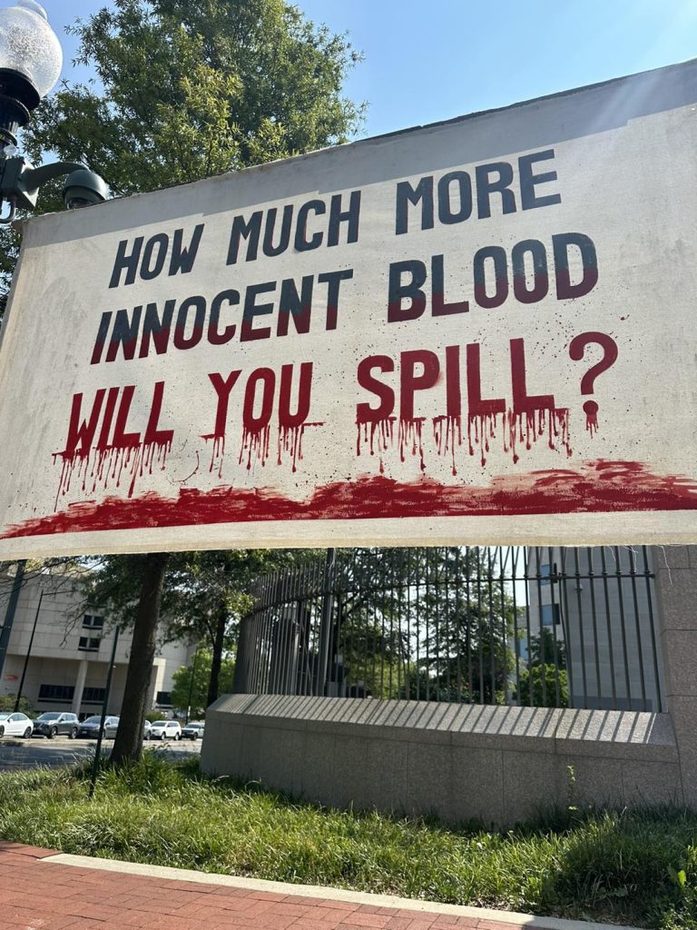 الاثنين 29 يوليو 2024، ناشيونال هاربور ماريلاند، فيرجينيا – في حوالي الساعة 11 صباحًا من صباح اليوم، شنت مجموعة من رجال الدين وأصحاب الديانات حصارًا بشريًا أمام حافلة مليئة بالمشاركين في قمة المسيحيين المتحدين من أجل إسرائيل (CUFI) 2024 في ناشيونال هاربور في طريقهم إلى مبنى الكابيتول للمطالبة بمزيد من الأسلحة والغطاء الدبلوماسي لدولة إسرائيل لمواصلة هجومها الوحشي على غزة.