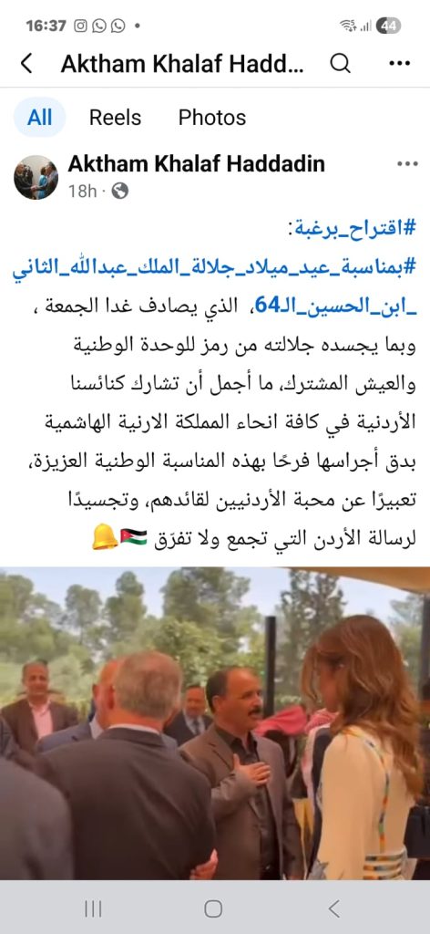 وأكّد الحدادين على أنّ هذا الحبَّ نابعٌ من تقديرِهم لمواقفِ الملكِ المُشرِّفة في الدّفاع عن المقدّساتِ الإسلاميّةِ والمسيحيّةِ في القدسِ الشّريف، وعن نهجِه الثّابت في ترسيخِ قيمِ المواطنةِ المتساويةِ والعيشِ المشترك.