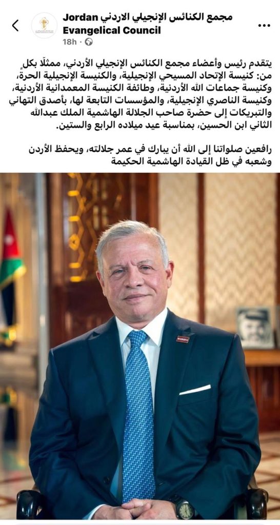 وفي نفس السياق تقدّمَ رئيسُ وأعضاءُ مجمع الكنائس الإنجيلي الأردني، ممثلًا بكلٍ من: كنيسة الإتحاد المسيحي الإنجيلية، والكنيسة الإنجيلية الحرة، وكنيسة جماعات الله الأردنية، وطائفة الكنيسة المعمدانية الأردنية، وكنيسة الناصري الإنجيلية، والمؤسسات التابعة لها، بأصدق التهاني والتبريكات إلى حضرة صاحب الجلالة الهاشمية الملك عبدالله الثاني ابن الحسين، بمناسبة عيد ميلاده الرابع والستين. ورفعوا صلواتهم إلى الله أن يبارك في عمر جلالته، ويحفظ الأردن وشعبه في ظل القيادة الهاشمية الحكيمة.
