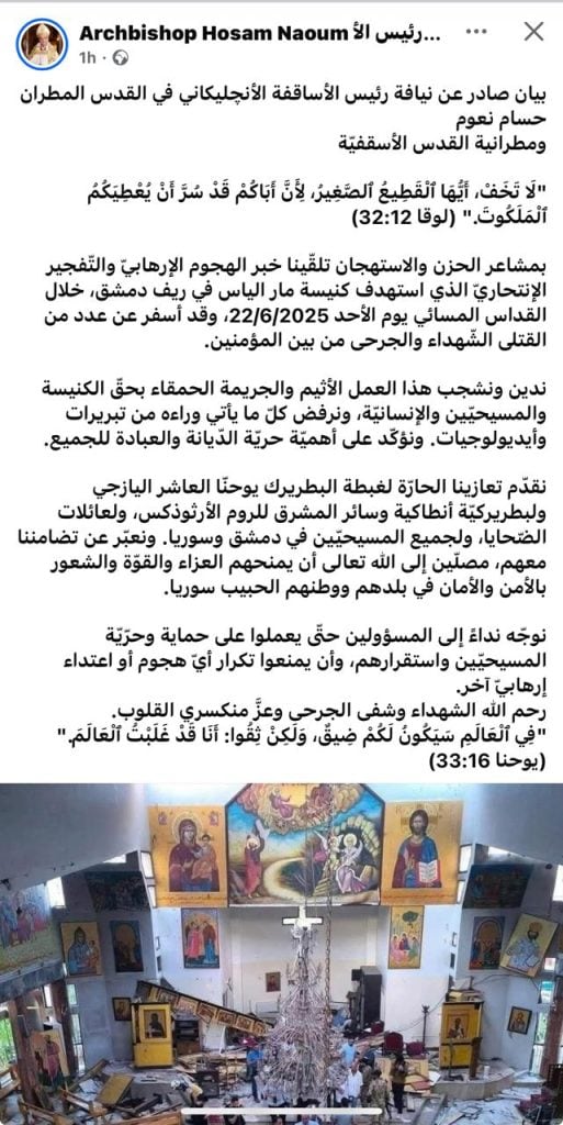 وفي بيان صادر عن نيافة رئيس الأساقفة الأنچليكاني في القدس المطران حسام نعوم ومطرانية القدس الأسقفيّة، عبّر فيه عن مشاعر الحزن والاستهجان بالهجوم الإرهابيّ والتّفجير الإنتحاريّ الذي استهدف كنيسة مار الياس في ريف دمشق، خلال القداس المسائي يوم الأحد وقد أسفر عن عدد من القتلى الشّهداء والجرحى من بين المؤمنين.