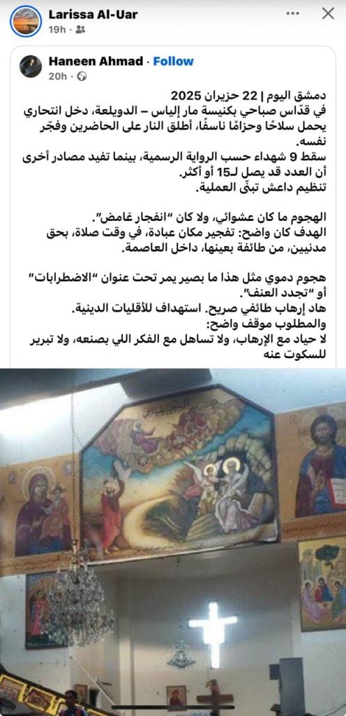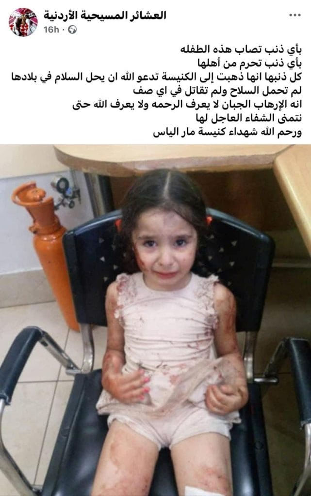 أدانتْ شخصيّات ومؤسّسات رسميّة ودينيّة مسيحيّة في الأردن وفلسطين وسوريا الهجوم الإرهابيّ الّذي تعرّضت له كنيسة “مار إلياس” وأدّى إلى وقوع انفجار عنيف في الكنيسة بمنطقة الدويلعة شرق العاصمة دمشق. وأدّى الحادث الّذي وقع مساء الأحد إلى ارتقاء عدد من المدنيّين ووقوع عدد من الجرحى، حيث قالت وزارة الداخليّة السوريّة، إنَّ انتحاريَّا يتبع لتنظيم داعش الإرهابي أقدم على الدّخول إلى كنيسة القديس مار إلياس في حيّ الدّويلعة بالعاصمة دمشق، وأطلق النّار، ثمَّ فجّر نفسه بواسطة سترة ناسفة. حيث تُشير المعلومات الأوّليّة لوزارة الصحّة السوريّة إلى أنَّ عدد ضحايا الهجوم الإرهابيّ وصل إلى 25 قتيلًا، و53 مُصابًا.