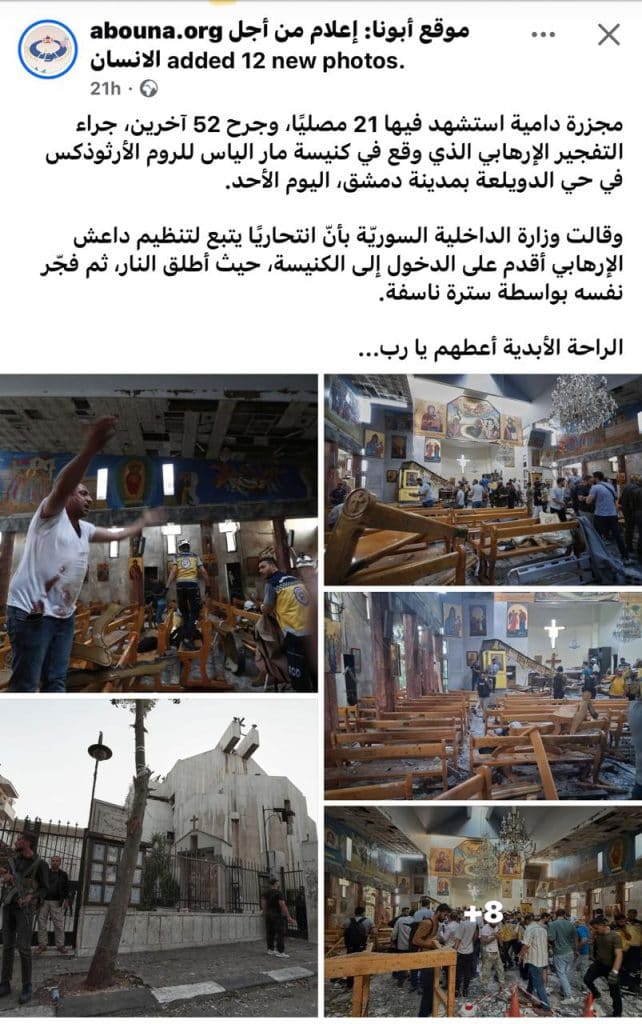 دان منتدى مسيحيي الأرض المقدسة التفجير الذي استهدف كنيسة مار الياس للروم الأرثوذكس في منطقة دويلعة بريف دمشق، مساء اليوم الاحد، وأدى إلى استشهاد 25 مصلياً على الأقل.