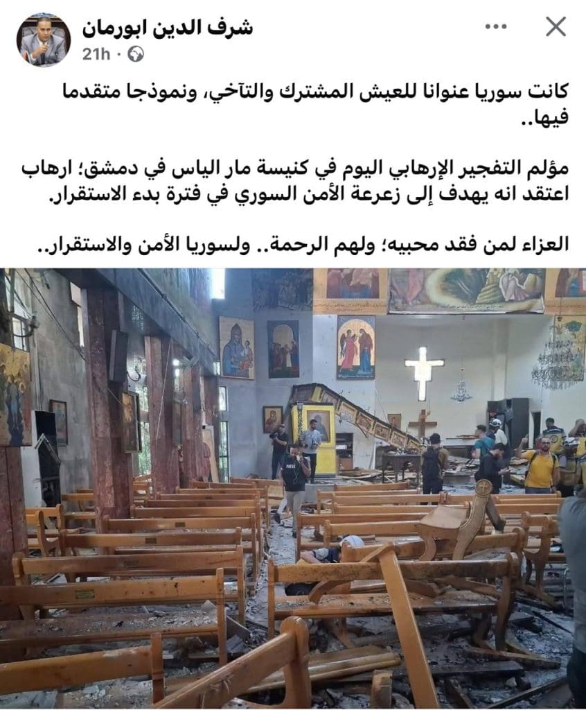 وقال المطران: ندين ونشجب هذا العمل الأثيم والجريمة الحمقاء بحقّ الكنيسة والمسيحيّين والإنسانيّة، ونرفض كلّ ما يأتي وراءه من تبريرات وأيديولوجيات. ونؤكّد على أهميّة حريّة الدّيانة والعبادة للجميع. نقدّم تعازينا الحارّة لغبطة البطريرك يوحنّا العاشر اليازجي ولبطريركيّة أنطاكية وسائر المشرق للروم الأرثوذكس، ولعائلات الضّحايا، ولجميع المسيحيّين في دمشق وسوريا. ونعبّر عن تضامننا معهم، مصلّين إلى الله تعالى أن يمنحهم العزاء والقوّة والشعور بالأمن والأمان في بلدهم ووطنهم الحبيب سوريا.