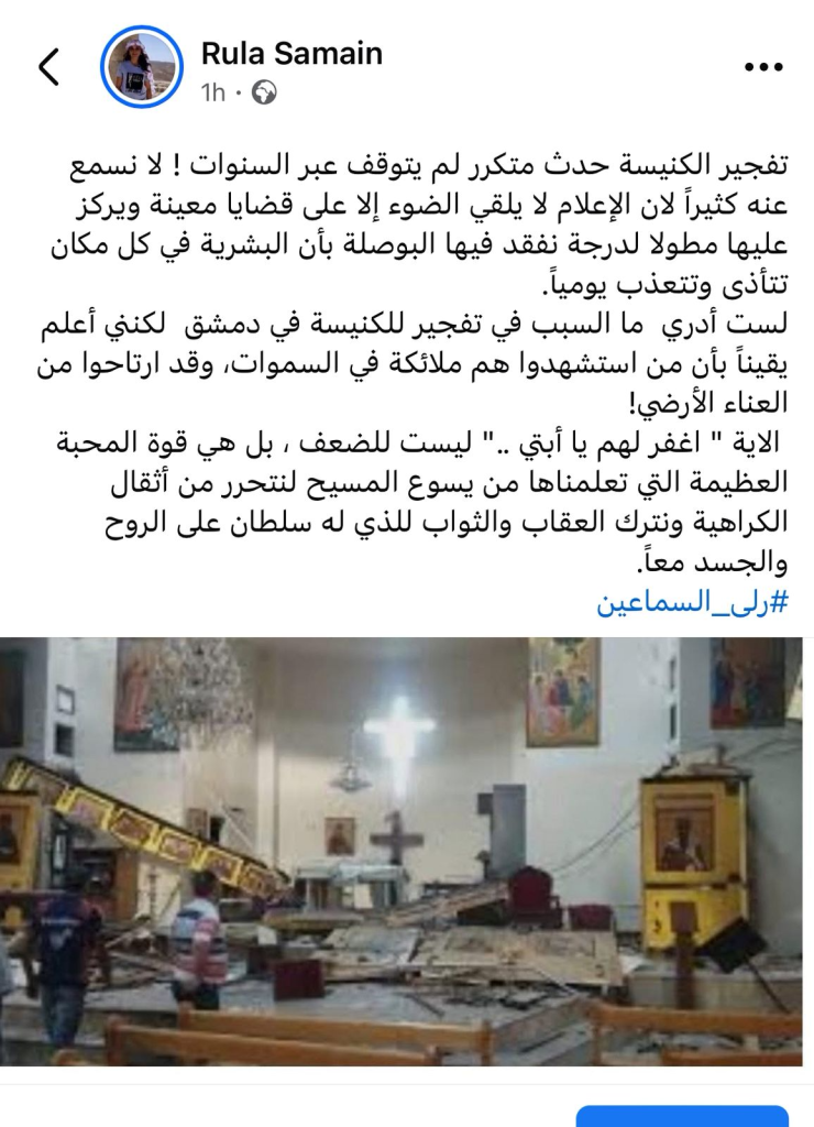 الهيئة الإسلاميّة المسيحيّة لنُصرة القدس والمُقدّسات: التفجير يخدم أجندات خارجيّة معادية تستهدف النّيل من اللُّحمة الإسلاميّة المسيحيّة الرّاسخة في عُمق التّاريخ السوريّ والعربيّ.