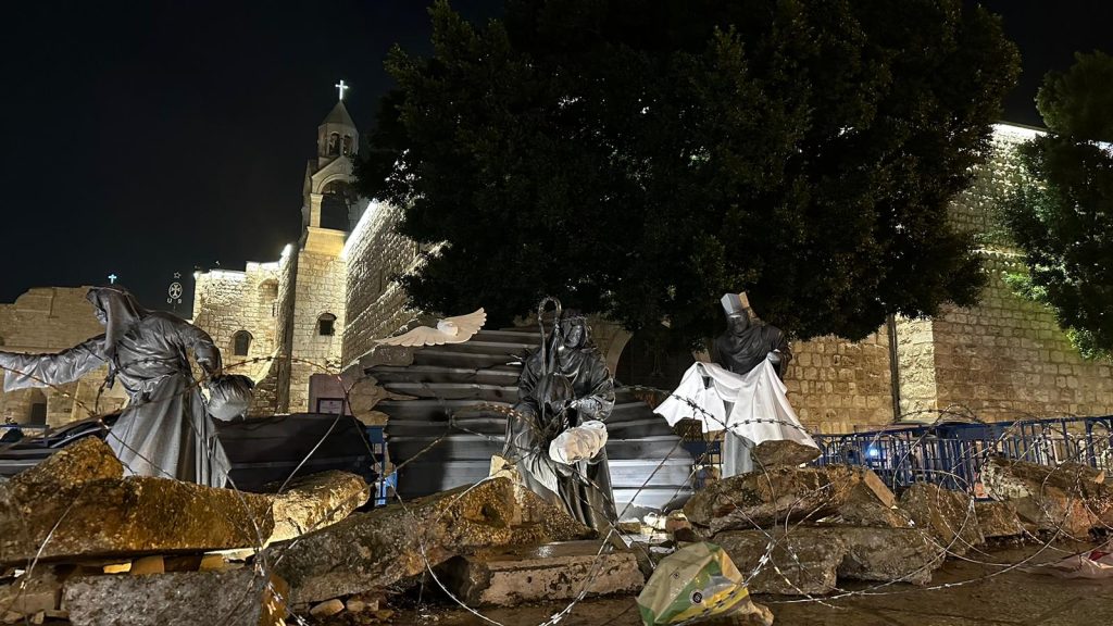 تدشين مغارة الميلاد في ساحة المهد التي تضمنت مغارة مقصوفة في اشارة لقصف الاحتلال لغزة