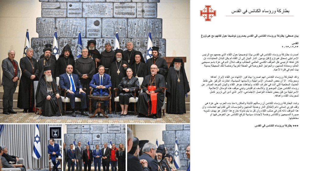 قال المطران اللوثري سني إبراهيم عازر لـ ملح الأرض أن لقاء رئيس دولة إسرائيل “لقاء سنوي” ويعتبر جزء من الستاتس كو status quo والذي “ندافع عنه في كل المحافل ولكل الأديان”. واوضح “لم نبادر للقاء الرئيس الإسرائيلي، بل هو الذي دعانا كما هي العادة كل سنة. واعتبر أن الانتقادات للقاء غير مبررة. التفاصيل هنا وللطلاع على بيان صادر عن أبناء الطوائف المسيحية في فلسطين ودول اللجوء والمنافي هنا اما في الرابط هنا تطلعون على بيان المبادرة العربية المسيحية “عروبة” والتي تستنكر لقاء رؤساء وممثلي الكنائس المسيحية مع حكومة الكيان الصهيوني.