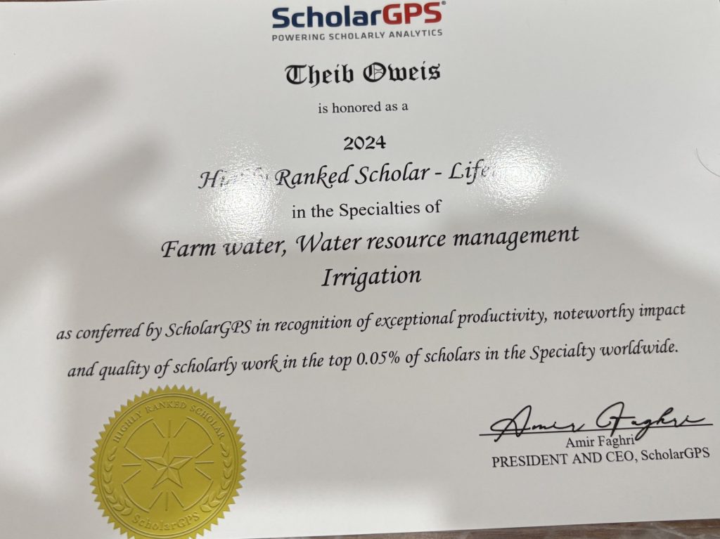 كرَّمَتْ هيئة تصنيف العلماء الدّوليّة (SCHOLAR-GPS) الدّكتور ذيب عويس لنيله المرتبة الثّالثة على مستوى علماء العالم في مجالات المياه والزراعة لعام 2024. وقد كان د.عويس، وهو العربيّ الوحيد الّذي حصل على هذا التّصنيف العالي، قد حقّق المرتبة الخامسة في نفس المجال لعام 2022.
