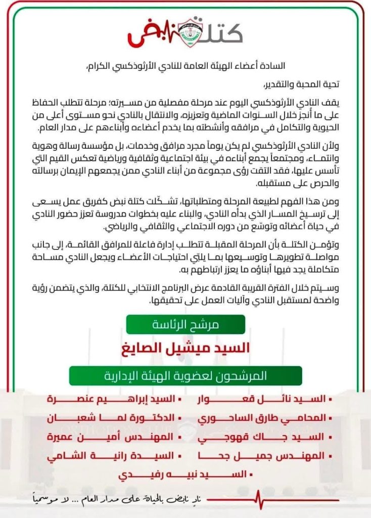 في إطارِ الحراكِ الانتخابيِّ داخلَ النادي الأرثوذكسي، طرحتْ كتلةُ “نبض” رؤيتَها للمرحلةِ المقبلةِ، مستندةً إلى ما تصفهُ بمرحلةٍ مفصليّةٍ تتطلّبُ الحفاظَ على منجزاتِ السنواتِ الماضيةِ، والانطلاقَ نحو تطويرٍ شاملٍ يواكبُ تطلّعاتِ الأعضاءِ.