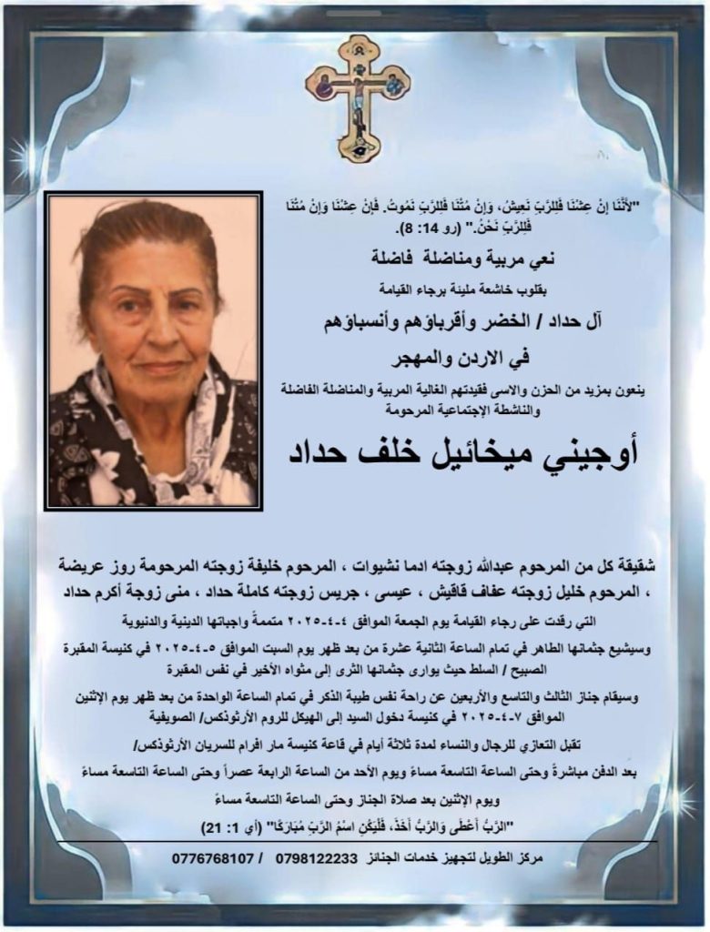 ودّع النُّشطاء في الأردن والمهجر المربّية والنّاشطة النّسويّة أوجيني ميخائيل حدّاد الّتي انتقلَتْ يوم الجمعة الموافق 4 نيسان 2025، ودُفنت في مسقط رأسها السّلط يوم السبت.