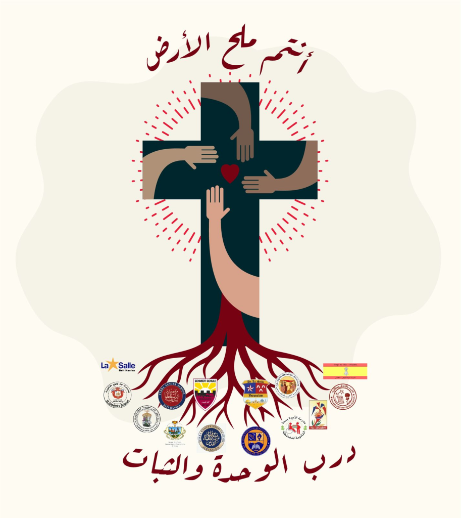 أما شعار درب الصليب هذا العام فله دلالة عميقة: صليب كُتب عليه “أنتم ملح الأرض” على خشب الصليب تمتد أربع أذرع نحو قلبٍ أحمر في المركز، رمزًا إلى قلب يسوع الأقدس، بينما تمثل جذوره المدارس المسيحية الخمس عشرة في القدس.