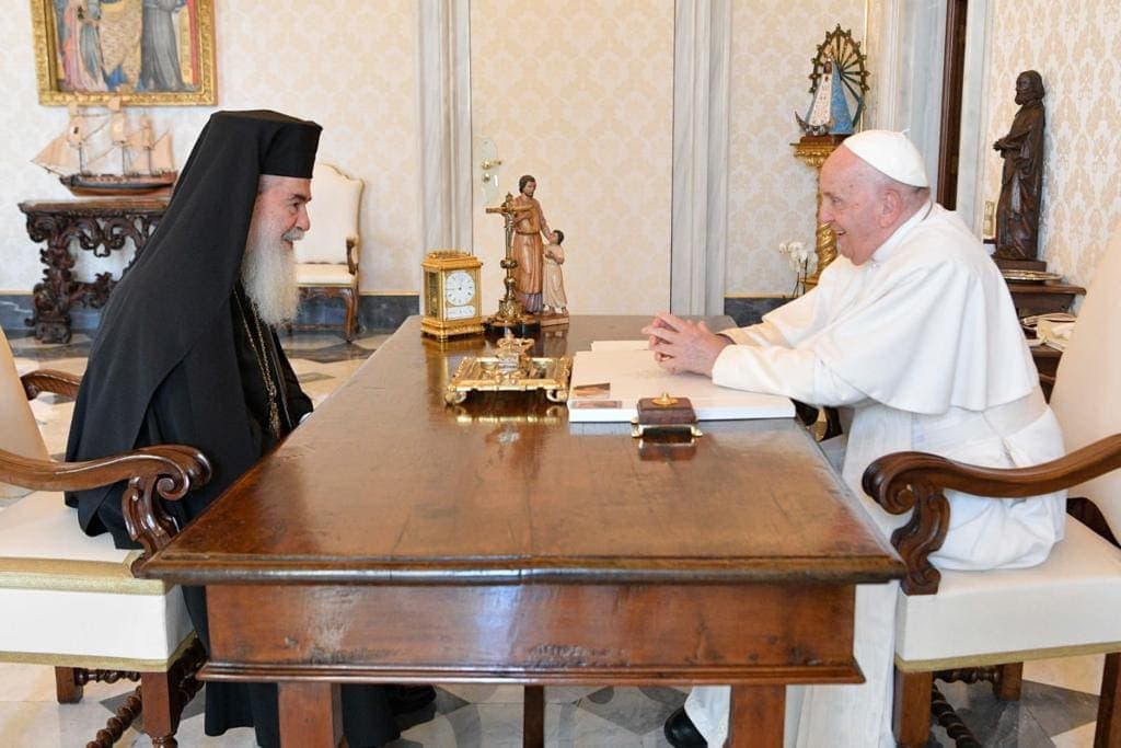 البابا التقى ايضًا مع بطريرك الروم الأرثوذكس القادم من القدس واتفقا على العمل معًا لمحاولة إحلال السلام بين روسيا وأوكرانيا. موقف البطريرك ثيوفيلوس المؤيد للوحدة المسيحية يتناقض مع موقف مطرانه في الأردن الذي عبر عن عدم قناعته بالوحدة المسيحية.