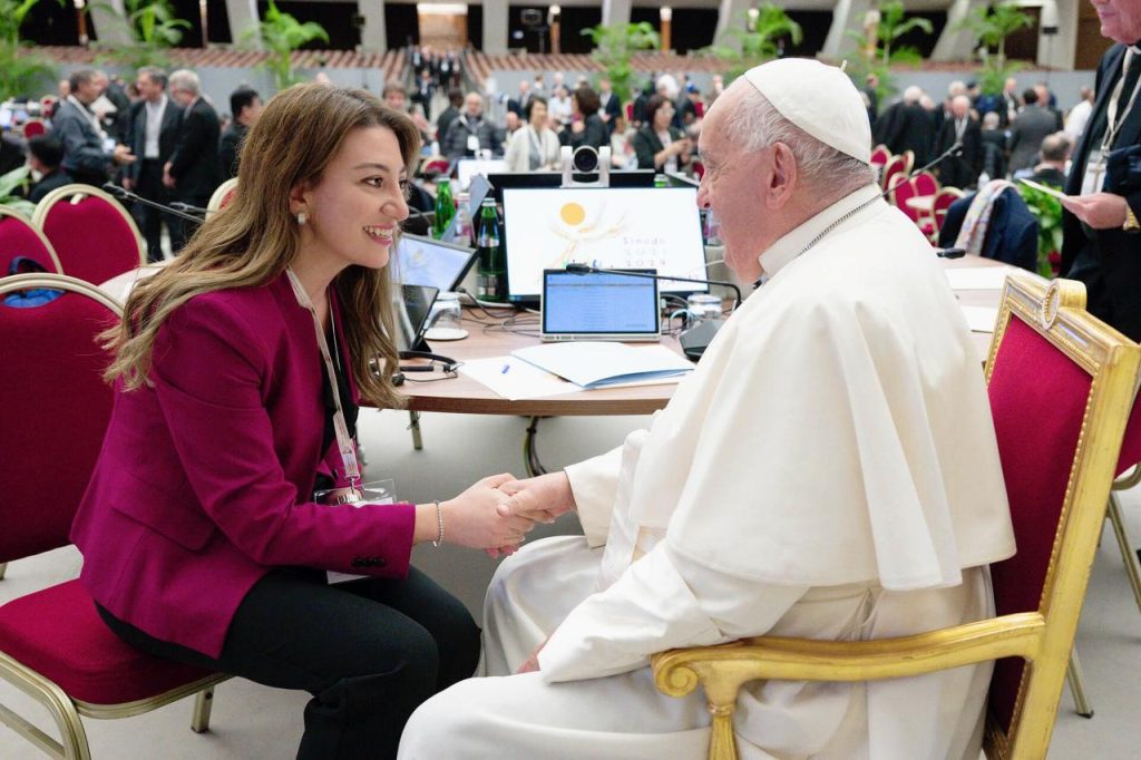 وتتحدثُ عن أجواءِ الإصغاءِ الحقيقيِّ التي لمستْها، وعن اهتمامِ الكرادلةِ والمطارنةِ بسماعِ صوتِ العلمانيينَ، ولا سيما الشبابِ والنساءِ، لما يحملونَهُ من رؤيةٍ قريبةٍ من الواقعِ. كما تؤكدُ أنَّ صوتَ الشرقِ الأوسطِ، في ظلِّ الحربِ والمعاناةِ، كان حاضرًا بقوةٍ، وأنَّ المشاركةَ لم تكنْ رمزيةً، بل فاعلةً ومؤثرةً.