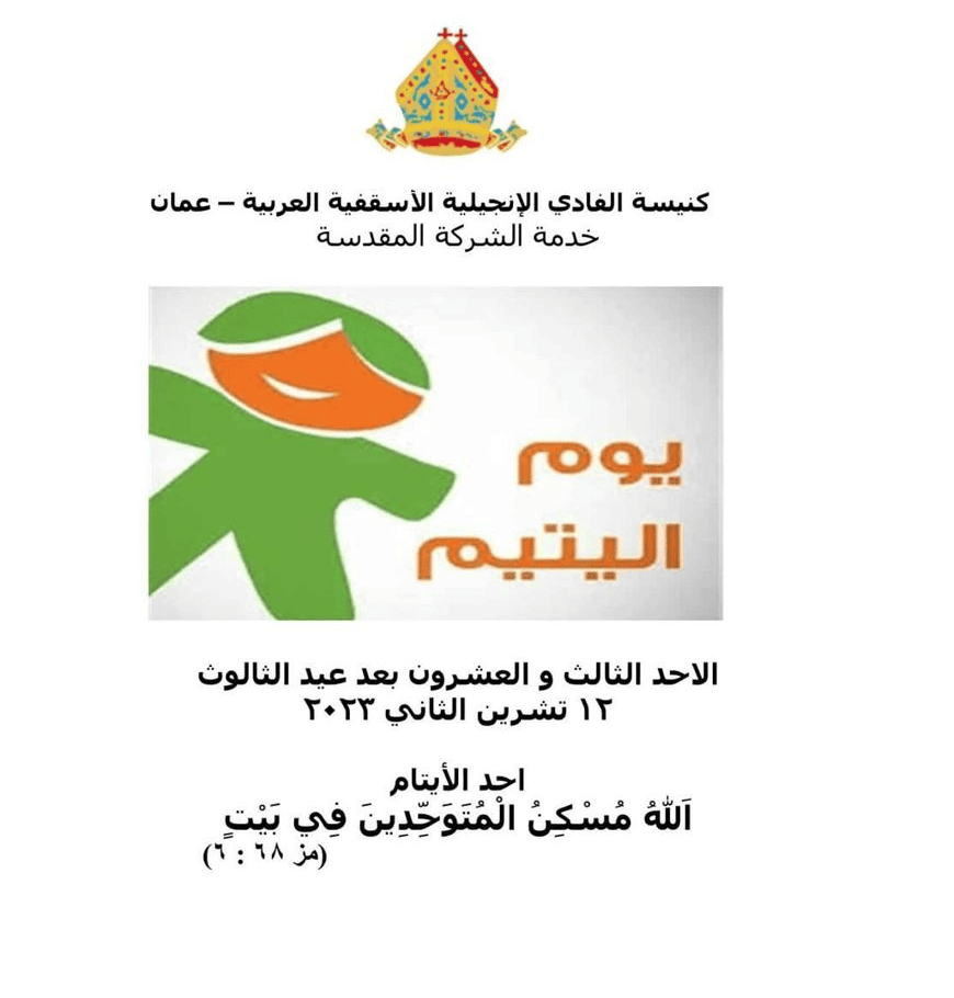 أقيم في العديد من كنائس الشرق الأوسط يوم الاحد الموافق 12-11-2023 يوم للصلاة خاص بالأيتام تحت شعار “لنتحد بالصلاة معا من أجل الأطفال الايتام في فلسطين” وذلك بتوجيه من مؤسسة سندك والتي تتخذ من العاصمة الأردنية مقرا لها.