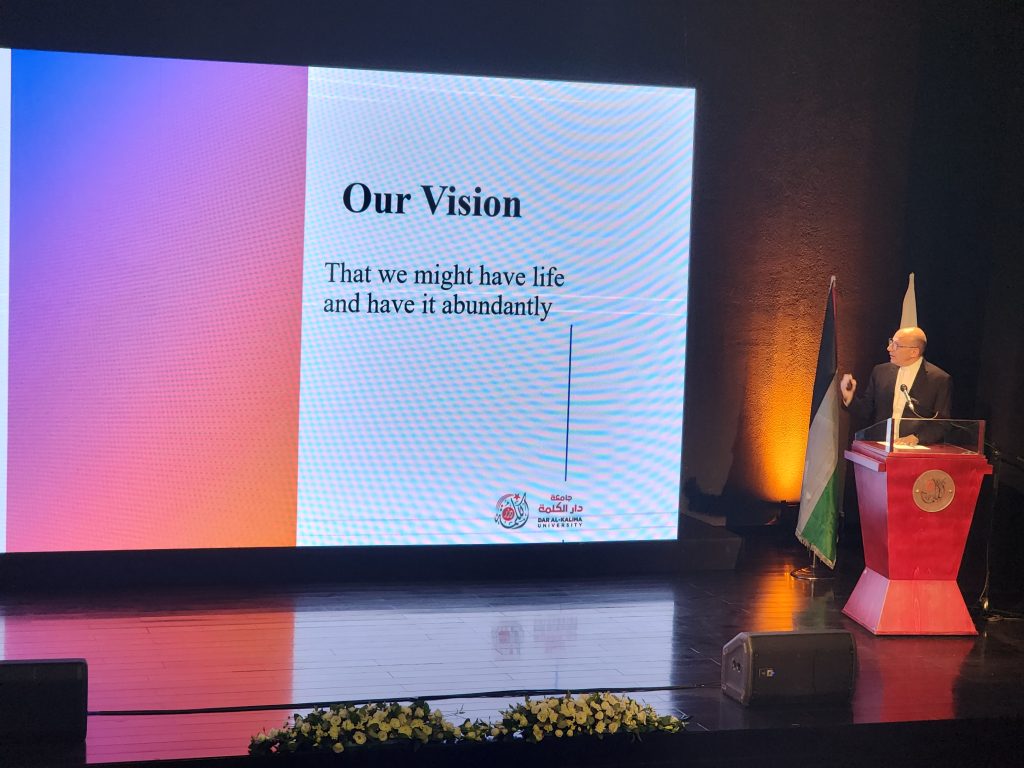 وافتتح المؤتمر القس البروفيسور متري الراهب مؤسس ورئيس جامعة دار الكلمة بكلمة، قال خلالها: “اهتمت جامعة دار الكلمة هذا العام ان يكون هذا المؤتمر الدولي والذي يتزامن مع الذكرى الخامسة والسبعين للنكبة أن يكون عنوان المؤتمر “الأرض والشعب والثقافة” ولكن هذا العام مؤتمرنا له طابع خاص ومميز أولاً بموضوعه وهذا مرتبط بهوية جامعة دار الكلمة التي جعلت من الثقافة ومن الفن ومن التصميم عنوان لها لتخصص، ولكن هذا المؤتمر مميز بحجمه أيضاً حيث نستضيف حوالي 200 زائر من 5 قارات من 25 دولة و60 جامعة في العالم، بالإضافة الى الأوراق حيث سيتم تقديم 60 ورقة محكمة من علماء وأساتذة، كما وانه ما يميز المؤتمر هذا العام الزيارات الميدانية التي تم تنظيمها مع ضيوفنا”.