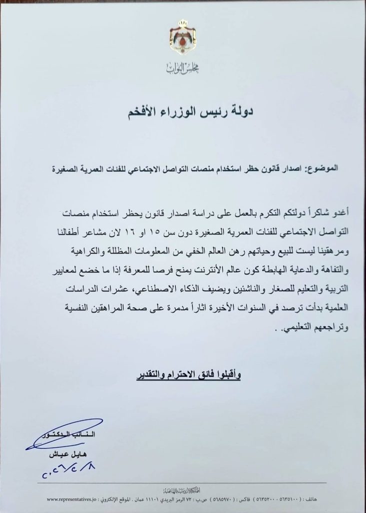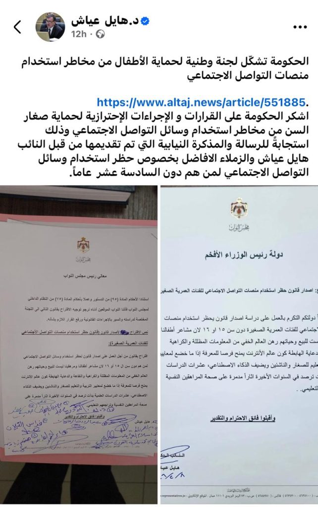 علّق الدّكتور هايل عيّاش، نائبُ المقعدِ المسيحيّ لمحافظةِ الزّرقاء، على المذكّرةِ النيابيّة الّتي تبنّاها عددٌ من النوّاب، والّتي تنصُّ على حظرِ استخدامِ مواقعِ التّواصلِ الاجتماعيّ للأطفالِ دون سنِّ 16 عامًا، مؤكّدًا أنّ هذه الخطوة جاءت استجابةً لقلقٍ مجتمعيٍّ حقيقيٍّ ومتزايد.