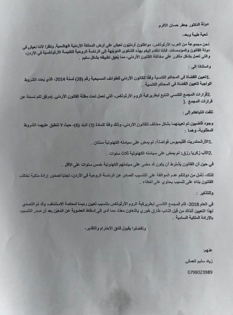 أرسل مجموعةٌ من الشخصيّات الأرثوذكسيّة في الأردن، رسالة شكوى إلى رئيس الوزراء الدُّكتور جعفر حسّان بحقِّ الرّئاسة الرّوحيّة للكنيسة الأرثوذكسيّة في الأردن، قائلين فيها إنَّها تعمل بشكلٍ مُتكرِّرٍ على مُخالفة القانون الأردنيّ، ممّا يُعيقُ تطبيقه بشكلٍ سليمٍ.