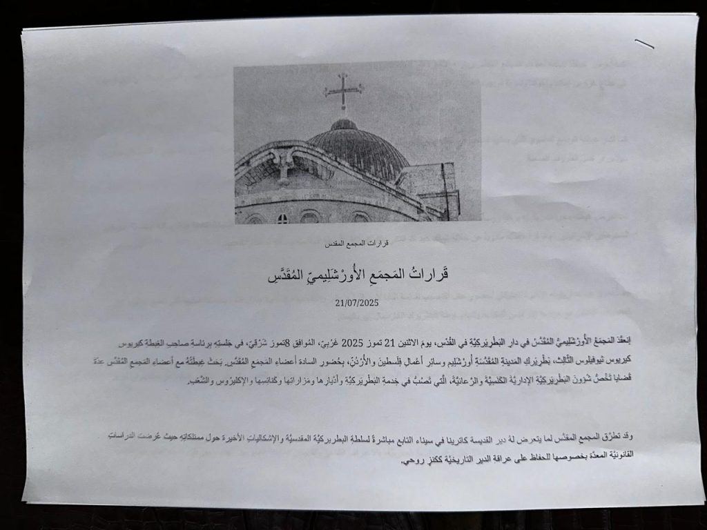 وختم العمش تصريحه لـ ملح الأرض بالقول “نُناشد دولة رئيس الوزراء أنْ يأخذ رسالتنا على محمل الجد، من أجل تفادي صدور إرادة ملكيّة مبنيّة على مُعطيات غير قانونيّة احترام القانون هو الأولويّة وليسَ الأشخاص، ونحنُ لا نهاجم أحدًا، بل نتمسَّكُ بتطبيق القانون وضمان عدالة المؤسَّسة الكنسيّة”.