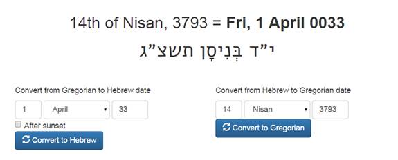 أما في حال ثبوت أن عمل الفداء كان في العام 33 للميلاد فإن يوم التهيئة في تلك السنة وهو 14 نيسان العبري يوافق يوم الجمعة الأول من نيسان بحسب التقويم المسيحي.