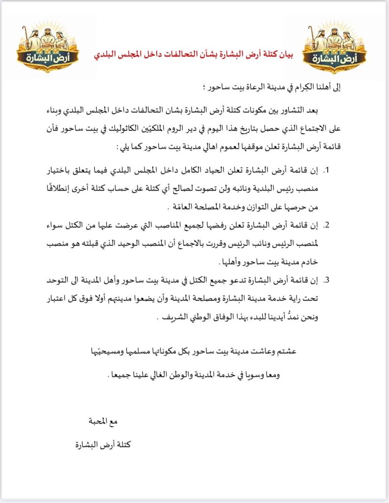 نرفق لكم بنود التوافق بين القوائم الانتخابية لمجلس بلدية بيت ساحور.