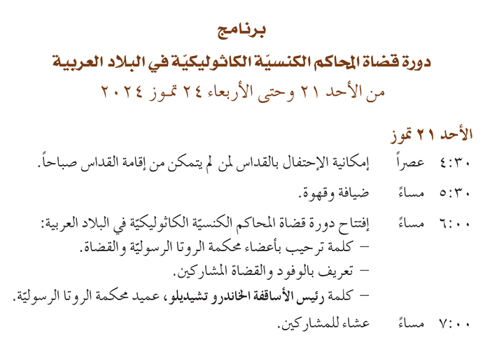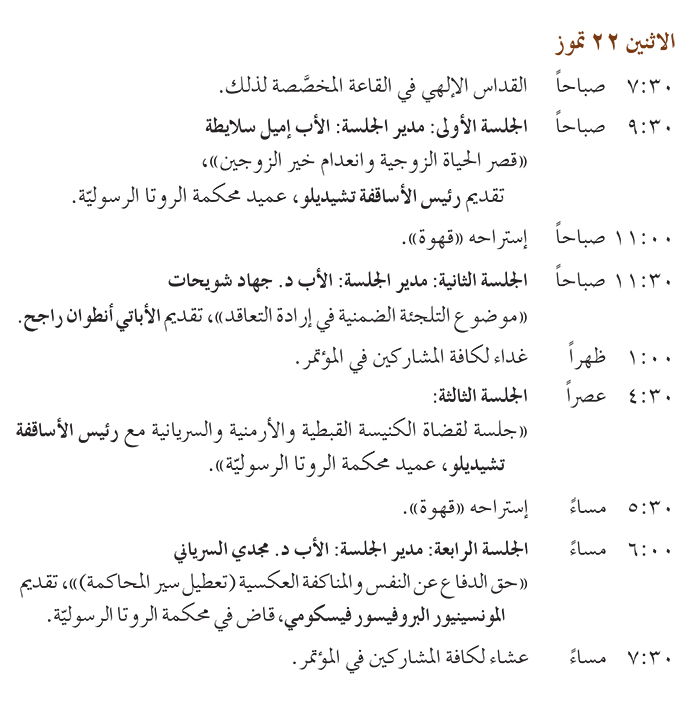 وبعد ختام الدورة الخاصة بقضاة المحاكم الكنسيّة الكاثوليكيّة في البلاد العربيّة (21-24 تموز)، سيتم افتتاح مؤتمر القانون الكنسيّ للمحامين (24-28 تموز)، والتي يتخللها كذلك ورشة عمل للأخصائيين النفسيين والعاملين الاجتماعيين (25-26 تموز)، وهي إضافة جديدة لأعمال مؤتمر هذا العام.