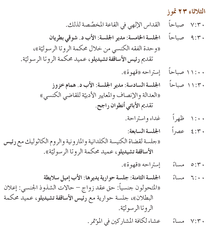 كما تتضمن ثلاث جلسات مع عميد محكمة الروتا الرسوليّة للقضاة، الأولى لقضاة محاكم الكنائس القبطيّة والأرمنيّة والسريانيّة، والثانيّة لقضاة محاكم الكنائس الكلدانيّة والمارونيّة والروم الملكيين، أما الثالثة فستكون جلسة عامة للتشاور في أمور تخص الشرق الأوسط.