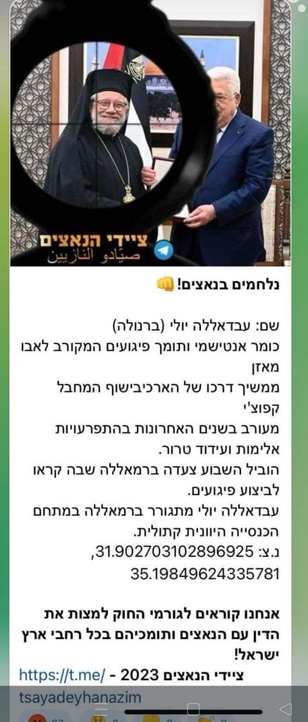 وجاء في المنشور معلومات حول الاب عبدالله يولي عبارات الكراهية “وانه كاهن معاد للسامية وإرهابي ” وانه شارك خلال الأسبوع في مسيرة مناصرة إلى الحرب على غزة