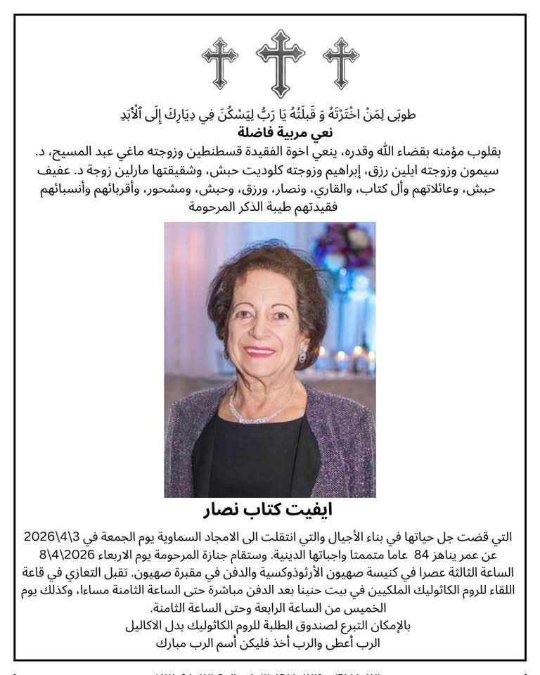 نعي ال كتاب وال نصار المعلمة أيفيت حنا كُتّاب -نصار التي انتقلت الى الامجاد يوم الجمعة 3-4-2026 وسيشيعي جثمانها الأربعاء الموافق 7 نيسان من كنيسة صهيون في القدس.