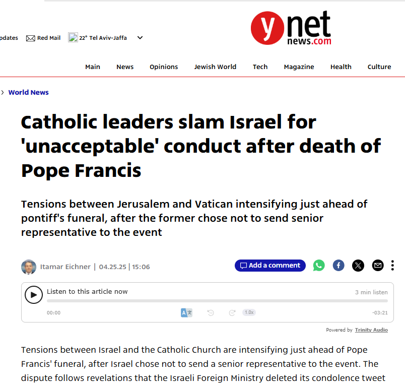 الموضوع: غياب التّعازي من الحكومة الإسرائيليّة في وفاة البابا فرنسيس