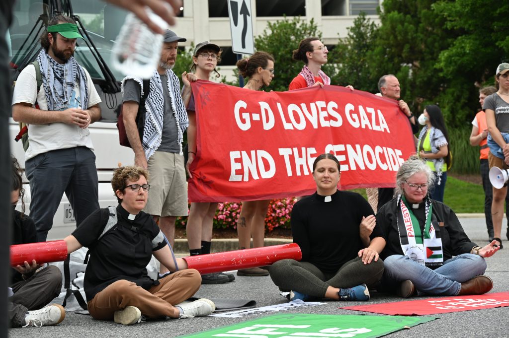 الاثنين 29 يوليو 2024، ناشيونال هاربور ماريلاند، فيرجينيا – في حوالي الساعة 11 صباحًا من صباح اليوم، شنت مجموعة من رجال الدين وأصحاب الديانات حصارًا بشريًا أمام حافلة مليئة بالمشاركين في قمة المسيحيين المتحدين من أجل إسرائيل (CUFI) 2024 في ناشيونال هاربور في طريقهم إلى مبنى الكابيتول للمطالبة بمزيد من الأسلحة والغطاء الدبلوماسي لدولة إسرائيل لمواصلة هجومها الوحشي على غزة. فيديو وصور هنا.