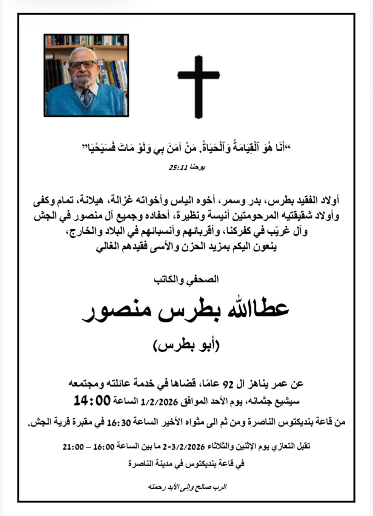 أعلنت عائلةُ منصور في الناصرة، صباح السبت، انتقالَ عميد العائلة، الصحفي المخضرم عطا الله منصور، عن عمر يناهز 92 عامًا. وجاء في إعلانِ الوفاةِ أنّهُ سيُشيَّع جثمانَهُ من قاعةِ بنديكتس في الناصرة يوم الأحد الموافق 1-2-2026، الساعة الثانية بعد الظهر، ثم سيتمُ دفن الراحل في الساعة الرابعة من نفسِ اليوم في مسقطِ رأسهِ، مقبرةُ قريته “الجش” في الجليل.