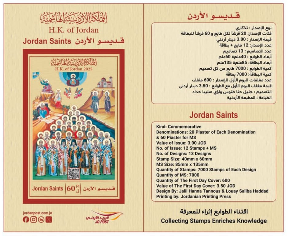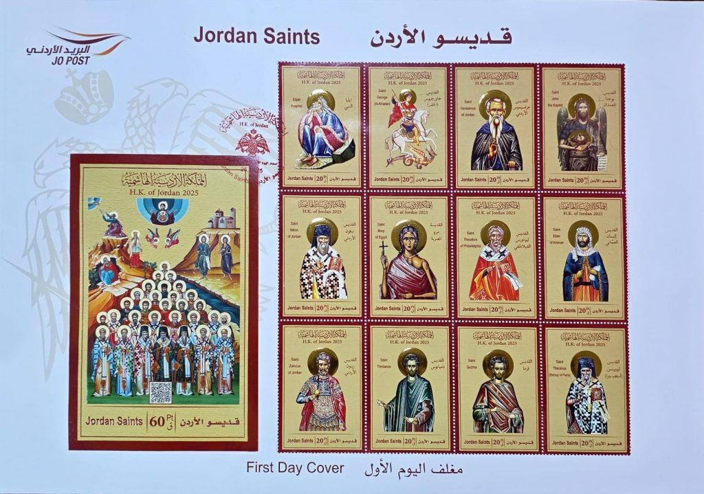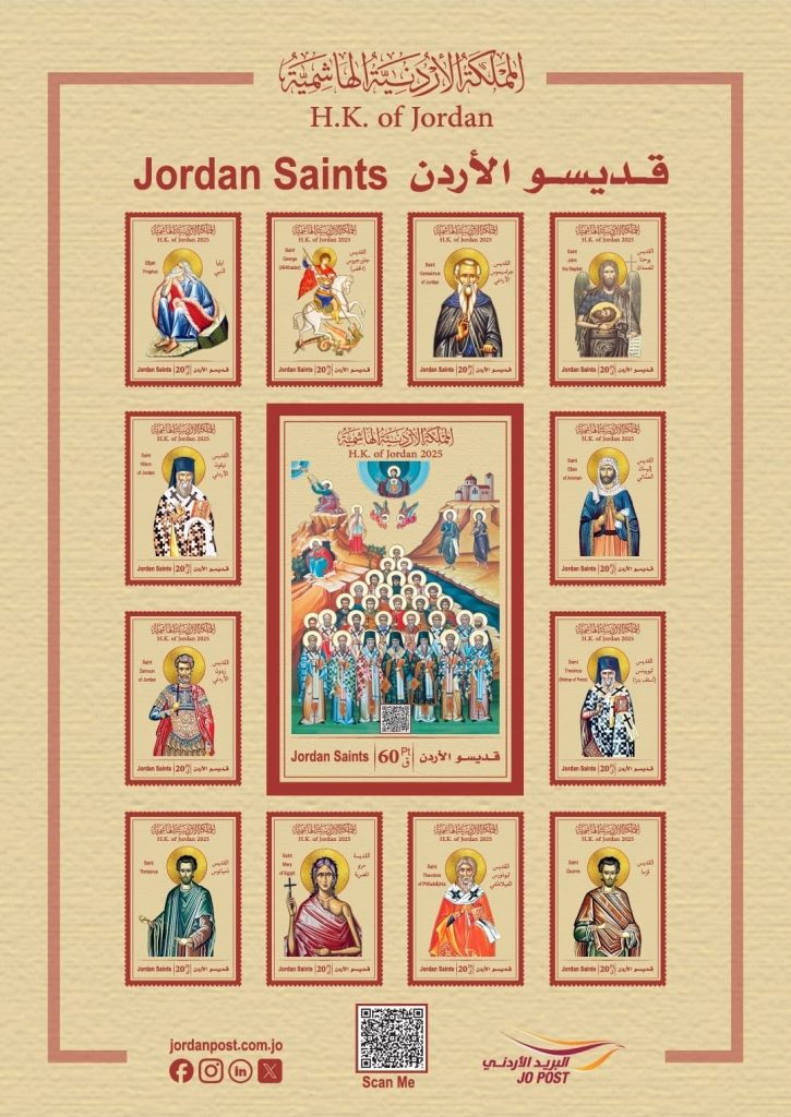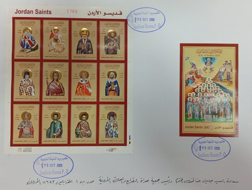 صدرَتِ اليوم السَّبت 25/10/2025 مجموعةُ طوابع تحت مُسمّى “قدّيسو الأردن” تتكوَّن من اثني عشر طابعًا وبطاقةٍ، وقال جليل حنّا طنّوس، رئيس جمعيّة هُواة الطّوابع والعُملات الأردنيّة لـ ملح الأرض أنّه تمَّ تصميم مجموعة الطّوابع مع زميله الأستاذ لؤي صليبا حداد عضو الهيئة العامّة في الجمعيّة وأنَّ الطّوابع هي عبارةٌ عن صورٍ لأيقوناتٍ بيزنطيّةٍ وبطاقةٌ عليها صورةٌ لأيقونةٍ تضمُّ جميع قدّيسي الأردن.