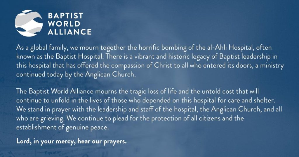 As a global Baptist World Alliance family, we mourn together the horrific bombing of the al-Ahli Hospital, often known as the Baptist Hospital in Gaza. There is a “vibrant and historic legacy of Baptist leadership in this hospital that has offered the compassion of Christ to all who entered its doors, a ministry continued today by the Anglican Church. I mourn the tragic loss of life and the untold cost that will continue to unfold in the lives of those who depend on this hospital for care and shelter. I stand in prayer with the leadership and staff of the hospital, the Anglican Church, and all who are grieving. I continue to plead for the protection of all citizens and the establishment of genuine peace. Lord, in your mercy, hear our prayers.