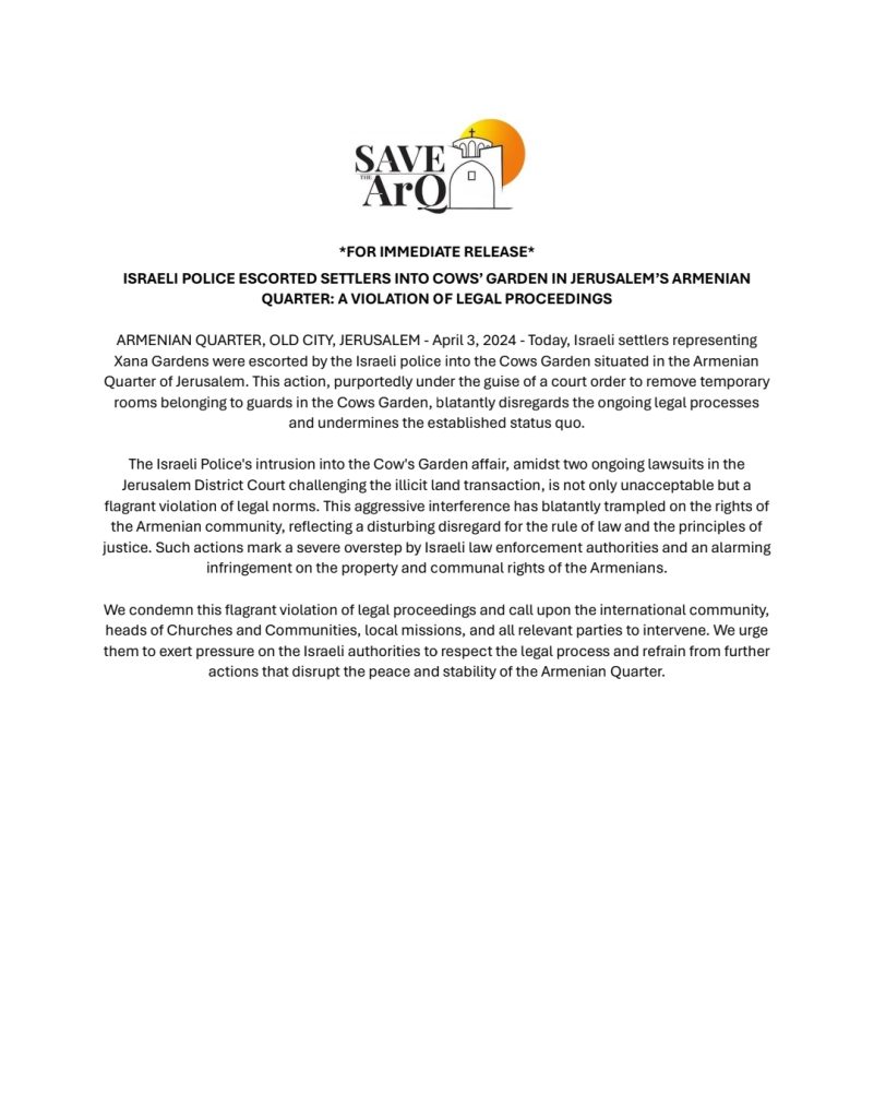 Leaders of the Save the Armenian Quarter Movement issued an impromptu video explaining the Israeli illegal actions. The Armenian Patriarchate issued A strongly worded communique denouncing the action and accusing the police of bias.