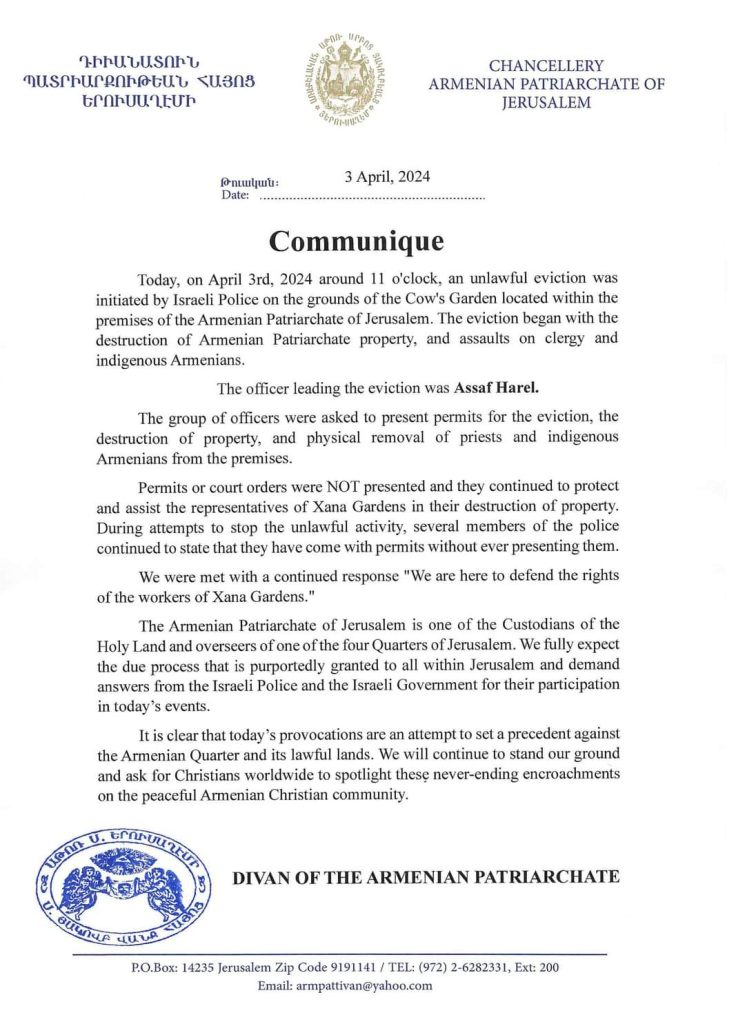 Unknown Israeli radical individuals with the protection of the Israeli police have illegally entered the parking lot of the Armenian Quarter built on an area called Cows Garden and destroyed a shed at the site. The action an attempt to change the status quo in this area carried out without any court-issued order appears to be the works of the Xana company that is trying to bypass the courts by insisting on their ownership of a sensitive and strategic Jerusalem old city area that is about one-fourth of the Armenian quarter. Two court cases have been filed at Israeli courts, one by the Armenian Community and one by the Armenian Patriarchate. Both aim to legitimize the centuries-old ownership of the Armenian property since 1700 AD.